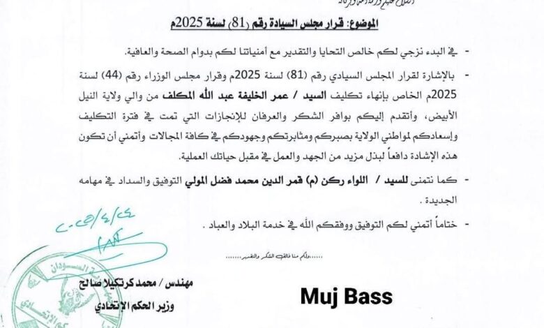 الأخبار إنها تكليف والي النيل الأبيض وتعيين خلف له عزة برس2025-04-24تابعنا على الواتساب لمزيد من الاخبارعزة برس2025-04-24 فيسبوك X لينكدإن ماسنجر ماسنجر واتساب تيلقرام