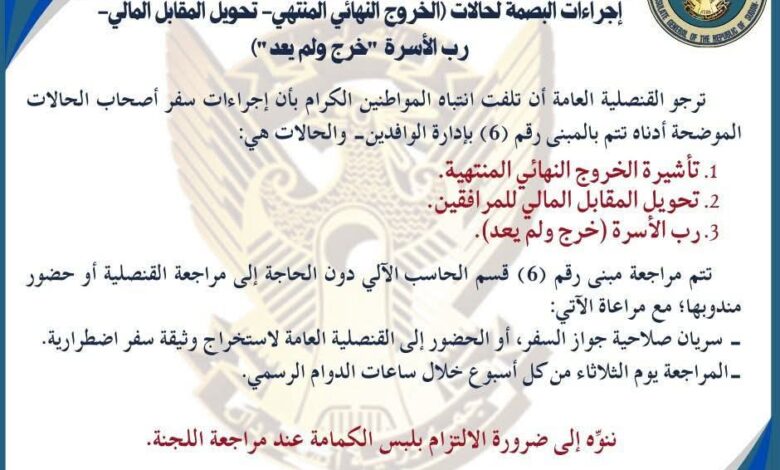 إجراءات البصمة لحالات ( الخروج النهائي المنتهي وتحويل المقابل المالي -رب الأسرة ـ خرج ولم يعد )