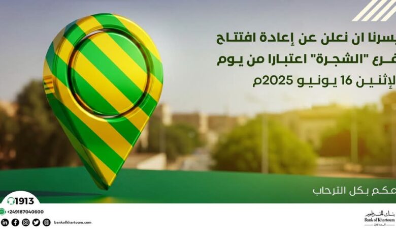 اعلن بنك الخرطوم عن إعادة تشغيل فرع “الشجرة-الخرطوم”، اعتبارا من يوم الاثنين الموافق 16 يونيو 2025. وقال البنك في نشرة على حسابه بفيسبوك:
