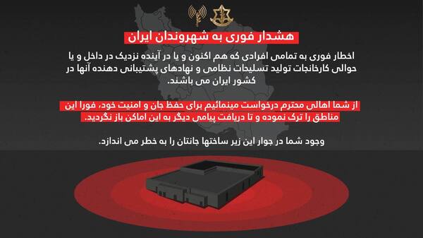 وقال على لسان المتحدث باسمه إن إنذار الإخلاء يشمل جميع مصانع الأسلحة والمنشآت الداعمة لها في إيران.