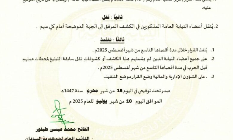 أصدر النائب العام قرار بتنقلات وسط أعضاء نيابة شملت (رؤساء نيابة - وكيل اعلي - وكيل اول - وكيل ثاني)