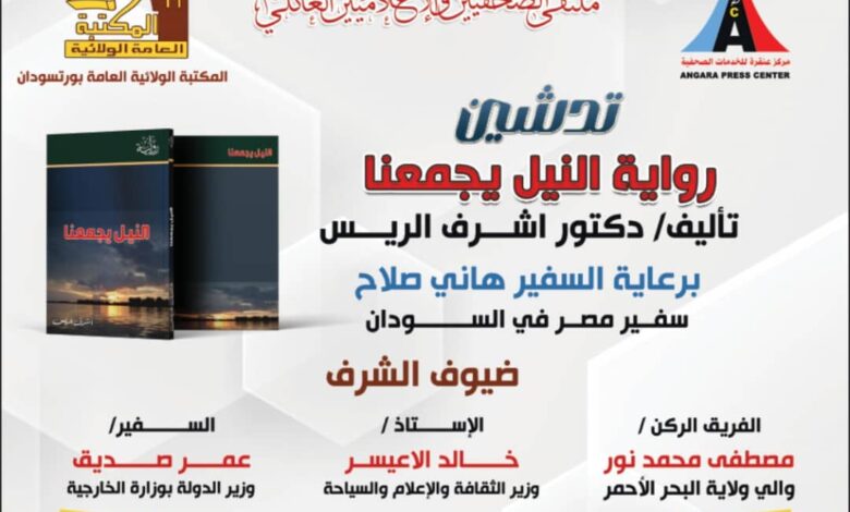 تشهد مدينة بورتسودان، السبت الموافق 2 أغسطس 2025، فعالية ثقافية متميزة بتدشين رواية “النيل يجمعنا” للكاتب الدكتور أشرف الريس، وذلك في المكتبة العامة الولائية، برعاية كريمة من سعادة السفير هاني صلاح، سفير جمهورية مصر العربية في السودان.