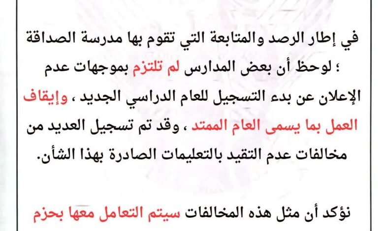 نهيب بجميع المدارس الالتزام الكامل بالتوجيهات الصادرة، حرصًا على سير العملية التعليمية وفق الأطر القانونية والتنظيمية.