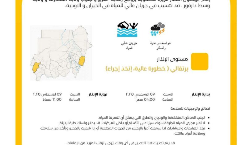 اصدرت الهيئة العامة للأرصاد الجوية انذار برتقالي من هطول أمطار غزيرة مصحوبة عواصف رعدية شرق وجنوب ولاية القضارف وولاية وسط دارفور