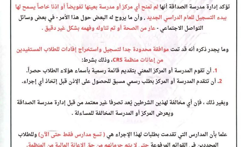تؤكد إدارة مدرسة الصداقة أنها لم تمنح أي مركز أو مدرسة بعينها تفويضاً أو اذنا خاصاً يسمح لها ببدء التسجيل للعام الدراسي الجديد , وأن ما يروج له البعض حول هذا الأمر – في بعض وسائل التواصل الاجتماعي – عار من الصحة أو تم تناوله وفهمه بشكل غير دقيق .