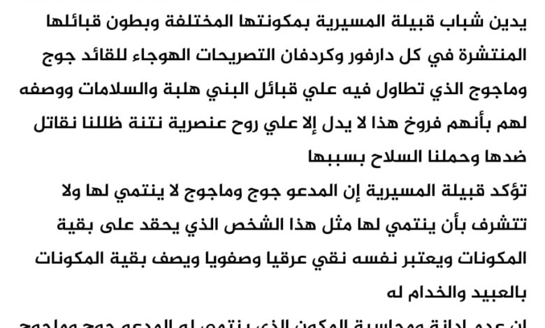 أصدر شباب قبيلة المسيرية بيانًا أعلنوا فيه تبرؤهم من المدعو جوج وماجوج، مدينين تصريحاته التي وصفوها بالهوجاء والعنصرية تجاه قبائل البني هلبة والسلامات، ومؤكدين أنه لا يمت للمسيرية بصلة، ولا تمثل مواقفه وتجاوزاته تاريخ القبيلة ولا قيمها.