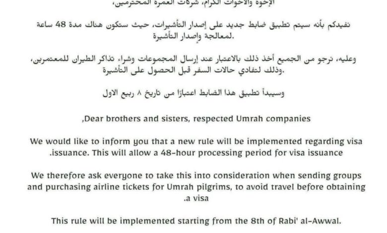 ودعت الوزارة شركات العمرة إلى مراعاة هذا الإجراء عند إرسال المجموعات وشراء تذاكر السفر للمعتمرين، تفاديًا لحدوث حالات سفر قبل الحصول على التأشيرة.