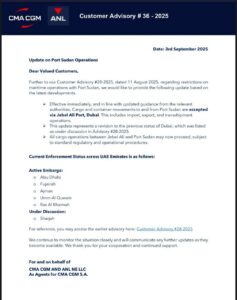 إشارة إلى تعميمنا السابق رقم (28-2025) الصادر بتاريخ 11 أغسطس 2025 بشأن القيود المفروضة على العمليات البحرية مع ميناء بورتسودان، نود أن نحيطكم علماً بآخر المستجدات: