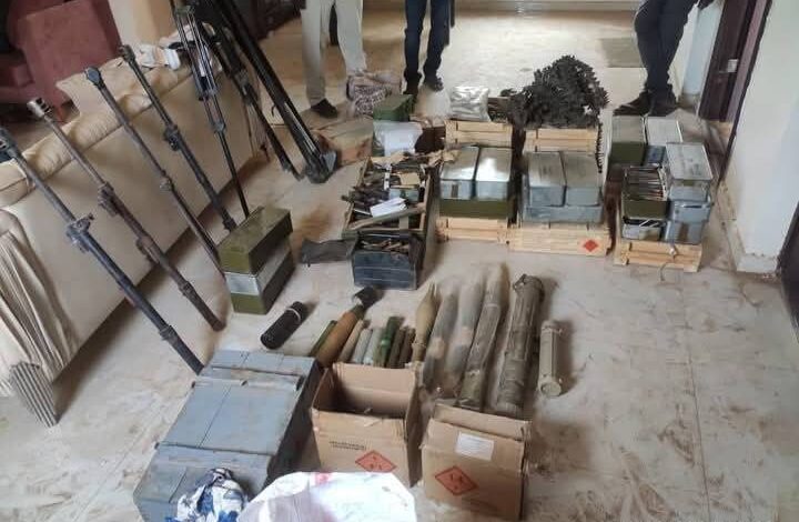 وأسفرت المداهمة عن ضبط كميات كبيرة من ذخائر الدوشكا، معبأة في صناديق وعلب وكراتين وجولات بلاستيكية، بالإضافة إلى كمية من مقذوفات مختلفة لمدفع أربجي، و بي تن، ودانات مدفع 82، وعدد من العبوات الناسفة، وذخائر مضادات الطيران.