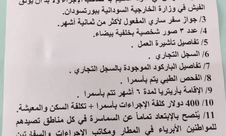 كما شددت على ضرورة إرفاق السجل التجاري وتفاصيله، واجتياز الفحص الطبي، والإقامة لمدة ستة أشهر في أسمرا لاستكمال الإجراءات، مع سداد رسوم قدرها 400 دولار تشمل السكن والمعيشة.