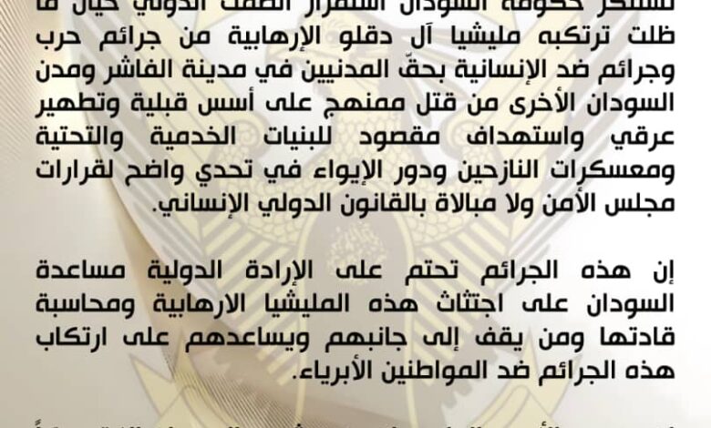 تستنكر حكومة السودان بشدّة استمرار الصمت الدولي حيال الجرائم البشعة التي ارتكبتها مليشيا آل دقلو الإرهابية بحق المدنيين في مدينة الفاشر وعدد من مدن السودان الأخرى، والمتمثلة في قتل ممنهج على أسس قبلية، وتطهير عرقي، واستهداف مقصود للبُنى الخدمية والتحتية، وكذلك استهداف معسكرات النازحين ومراكز الإيواء، في تحدٍ صارخ لقرارات مجلس الأمن والقانون الدولي الإنساني.