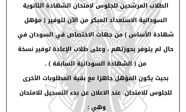 تعلن مدرسة الصداقة السودانية بالقاهرة جميع الطلاب المرشحين للجلوس لامتحان الشهادة الثانوية السودانية( ٢٠٢٥ ) الاستعداد المبكر لتوفير ( مؤهل شهادة الأساس ) من جهات الاختصاص في السودان في حال لم يتوفر بحوزتهم ، وعلى طلاب الإعادة توفير نسخة من ( الشهادة السودانية السابقة ) .