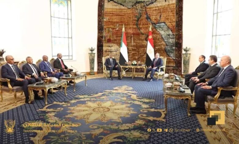 وأشار المتحدث الرسمي إلى أن الاجتماع تطرق إلى مستجدات ملف مياه النيل، حيث جدد الجانبان رفضهما القاطع لأي إجراءات أحادية تُتخذ على النيل الأزرق، بما يتعارض مع أحكام القانون الدولي ذات الصلة. وفي السياق ذاته، شدد رئيس مجلس السيادة السوداني على وحدة الموقف بين مصر والسودان، وتطابق مصالحهما إزاء قضية السد الإثيوبي. واتفق الرئيسان، في هذا الإطار، على تعزيز وتكثيف آليات التشاور والتنسيق بين البلدين لضمان حماية الحقوق المائية المشتركة.