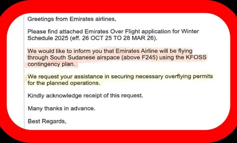 كشف الصحفي عبد الماجد عبد الحميد عن تطور مفاجئ في ملف الطيران بين السودان والإمارات، موضحًا أن شركة طيران الإمارات تقدمت رسميًا بطلب إلى سلطة الطيران المدني السوداني للحصول على تصريح عبور المجال الجوي لجنوب السودان عبر الممر الجوي (F245) باستخدام خطة الطوارئ (KFOSs).