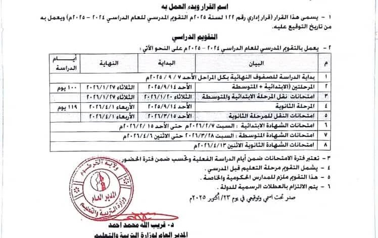 وشدد القرار على الالتزام بالتقويم الرسمي والعطلات المحددة، مشيرًا إلى أن الامتحانات تُحتسب ضمن أيام الدراسة الفعلية، مع ضرورة انضباط المدارس الحكومية والخاصة بالتنفيذ الكامل للجدول المعتمد.