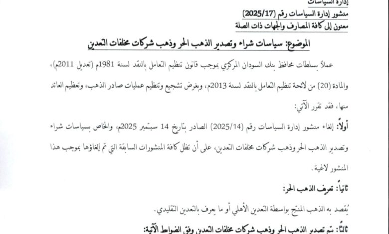 أصدر بنك السودان المركزي، اليوم الأربعاء، منشور إدارة السياسات رقم (17/2025) المتعلق بسياسات شراء وتصدير الذهب الخام وذهب شركات مخلفات التعدين، موجهاً إلى كافة المصارف والبنوك العاملة ذات الصلة.