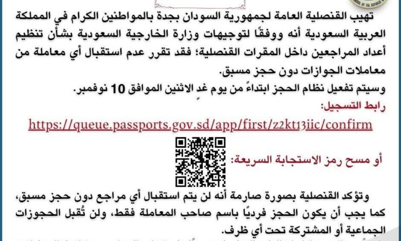 تهيب القنصلية العامة لجمهورية السودان بجدة بالمواطنين الكرام في المملكة العربية السعودية أنه وفقا لتوجيهات وزارة الخارجية السعودية بشأن تنظيم اعداد المراجعين داخل القنصلية فقد تقرر عدم استقبال أي معاملة من معاملات الجوازات دون حجز مسبق