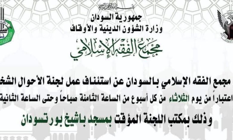 يعلن مجمع الفقه الإسلامي بالسودان عن استئناف عمل لجنة الفتوى في قضايا الأحوال الشخصية وذلك اعتبارا من يوم