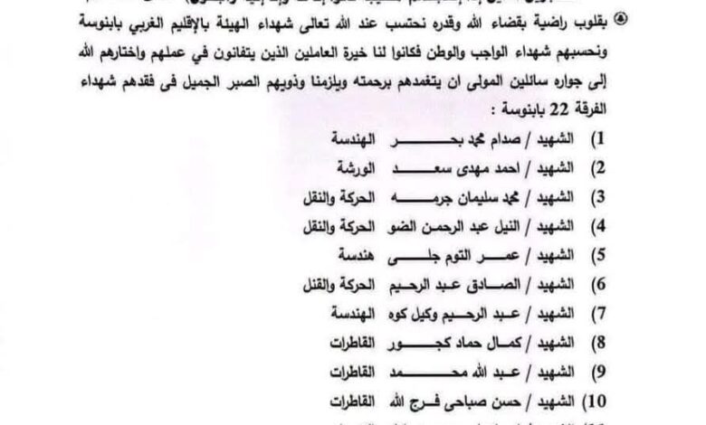 وجاء في البيان أن الشهداء ينتمون إلى الفرقة 22 بلنيسة، وقد وافاهم الأجل وهم يؤدون واجبهم المهني والوطني، مؤكداً أنهم من خيرة العاملين الذين عُرفوا بالتفاني في خدمة البلاد. وتقدّم المدير العام للهيئة المهندس موسى القوم الجيلي بخالص التعازي لأسر الشهداء وزملائهم، سائلاً الله أن يتغمدهم بواسع رحمته ويلهم ذويهم الصبر والسلوان.