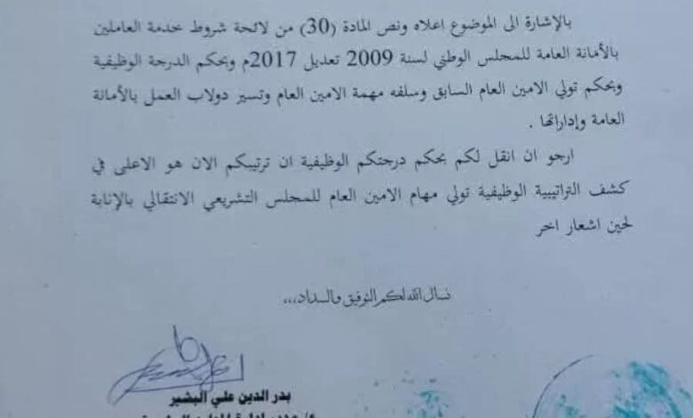 وأكدت إدارة الموارد البشرية أن الدرجة الوظيفية للموظف المعني تُعد الأعلى في الكشف الوظيفي، مما يجعله الأنسب لتولي مسؤوليات الأمين العام للمجلس التشريعي الانتقالي بصفة مؤقتة.