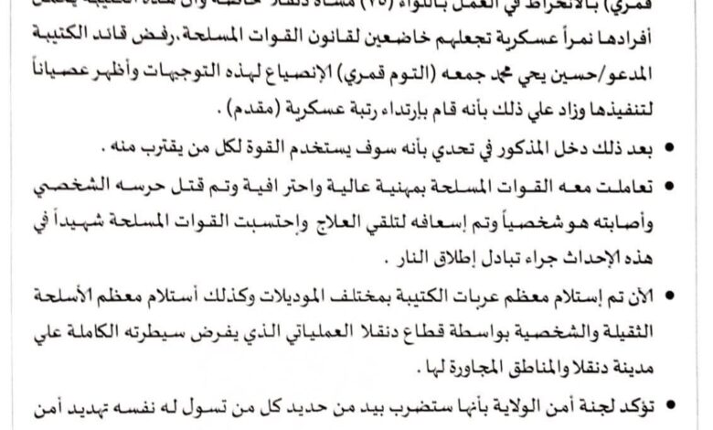 وأوضحت اللجنة أن القوات المسلحة تعاملت مع قائد الكتيبة بمهنية عالية بعد تهديده باستخدام القوة ضد أي جهة تقترب منه، مشيرة إلى إصابته خلال تبادل محدود لإطلاق النار قبل إسعافه لتلقي العلاج.