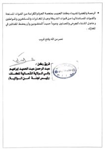 وحذرت لجنة أمن الولاية من أي محاولات تهدد أمن المواطنين، ودعت كل من يمتلك أسلحة أو مركبات تعود للكتيبة المعزولة إلى التبليغ وتسليمها خلال 48 ساعة.
