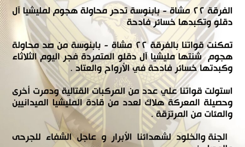 أعلنت الفرقة 22 مشاة في منطقة بابنوسة، صباح الثلاثاء، أنها تمكنت من صدّ محاولة هجوم مسلّح نفذته قوات تابعة لمليشيا الدعم السريع، وفق بيان صادر عن الفرقة.