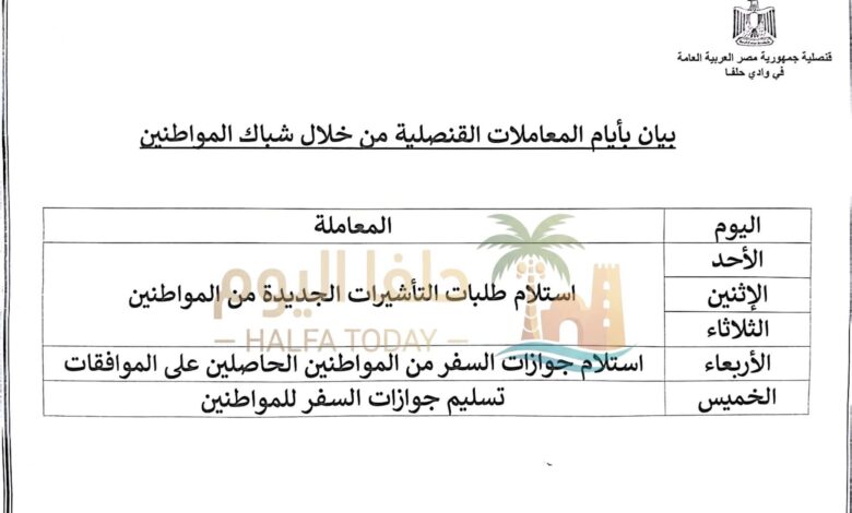 أعلنت القنصلية العامة لجمهورية مصر العربية بوادي حلفا عن اعتماد جدول جديد لتنظيم العمل المتعلق بطلبات التأشيرات، وذلك حرصاً على راحة المتقدمين ومنعاً للتكدس أمام شباك الجمهور.