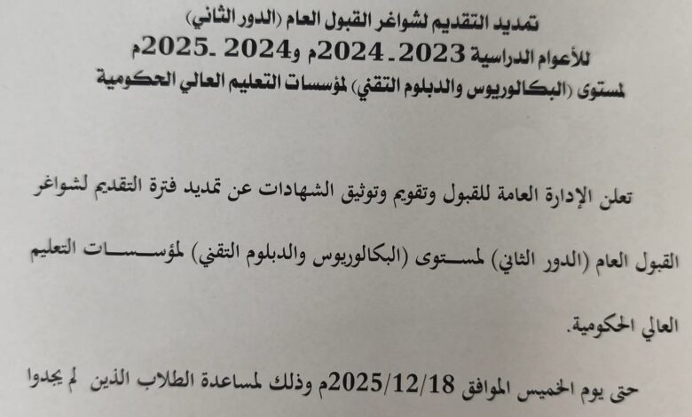 أعلنت الإدارة العامة للقبول وتقويم وتوثيق الشهادات بوزارة التعليم العالي عن تمديد فترة التقديم لشواغر القبول العام للدور الثاني للأعوام 2023–2024 و2024–2025، وذلك لمستويي البكالوريوس والدبلوم التقني بمؤسسات التعليم العالي الحكومية.