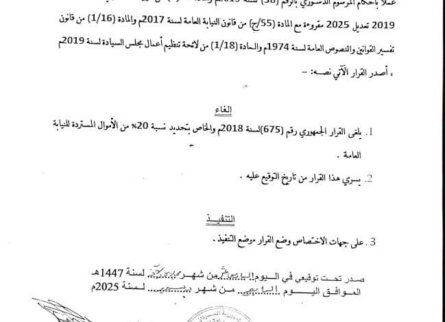 أصدر مجلس السيادة الانتقالي قراراً جديداً يحمل الرقم (39) لسنة 2025، قضى بإلغاء القرار الجمهوري رقم (675) لسنة 2018، والمتعلق بتجديد نسبة الـ20% من الأموال المستردة للنيابة العامة.