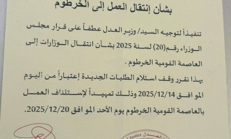 اعلن المسجل التجاري العام وقف استلام الطلبات الجديدة في بورتسودان منذ اليوم ٢٠٢٥/١٢/١٤ وذلك تمهيداً لاستئناف العمل بالعاصمة القومية الخرطوم اعتبارا من يوم الاحد ٢٠٢٥/١٢/٢٠