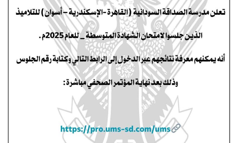 أعلنت المستشارية الثقافية بـسفارة جمهورية السودان بالقاهرة، أن مدرسة الصداقة السودانية بالقاهرة ستتيح لطلابها الذين جلسوا لامتحان الشهادة المتوسطة للعام 2025م معرفة نتائجهم إلكترونيًا، وذلك عقب انتهاء المؤتمر الصحفي المخصص لإعلان النتائج مباشرة.