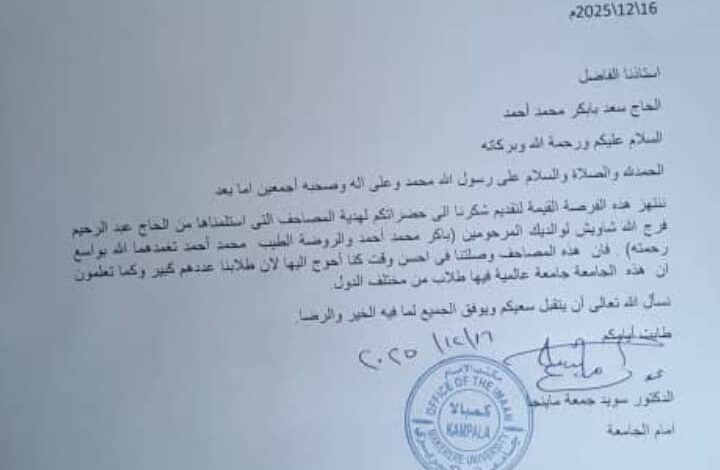 قدمت إدارة مسجد جامعة ماكيريري في كمبالا، أوغندا، شكرها العميق لرجل الأعمال السوداني والمدير العام لشركة تاركو للطيران سعد بابكر أحمد محمد نور على دعمه لمسجد الجامعة، والذي استفاد منه طلاب المؤسسة من مختلف الدول.