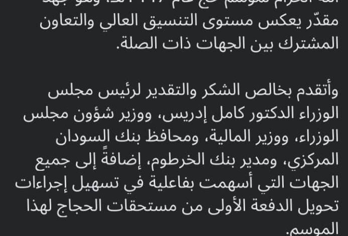 وثمّن الوزير الدور الذي اضطلع به كل من رئيس مجلس الوزراء الدكتور كامل إدريس، ووزير شؤون مجلس الوزراء، ووزير المالية، ومحافظ بنك السودان المركزي، ومدير بنك الخرطوم، إلى جانب بقية المؤسسات المعنية، في تسهيل إجراءات تحويل مستحقات الحجاج وإنجازها في وقتها.