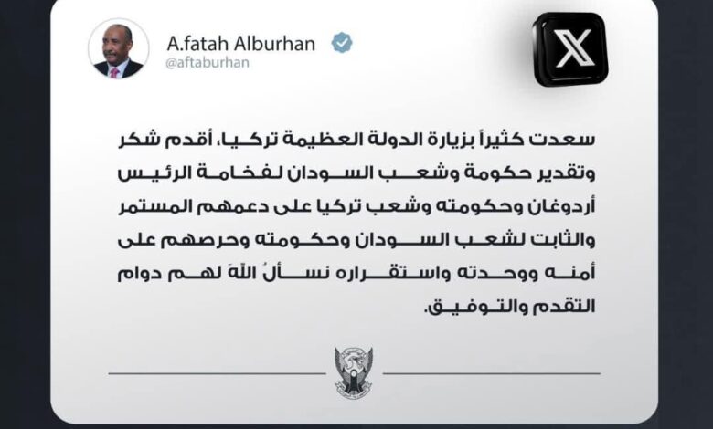 وتأتي تغريدة البرهان عقب زيارة رسمية لتركيا، بحث خلالها سبل تعزيز العلاقات الثنائية والتعاون المشترك بين البلدين على المستويين الإقليمي والدولي.
