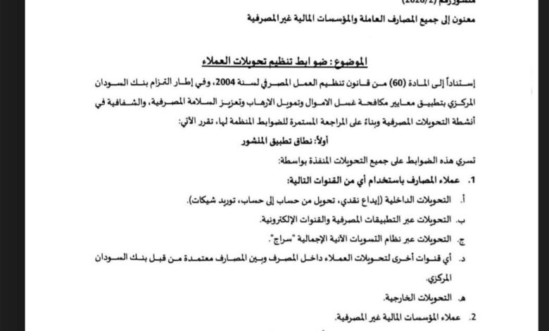 أصدر بنك السودان المركزي منشورًا جديدًا بشأن تنظيم وتحكم ضوابط تحويلات العملاء، في إطار جهوده لتعزيز السلامة المصرفية ومكافحة غسل الأموال وتمويل الإرهاب، وضمان الشفافية في أنشطة التحويلات المالية.