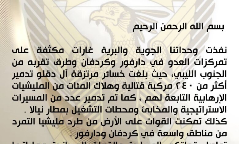 وأوضحت القيادة أن العمليات أسفرت عن تدمير أكثر من 240 مركبة قتالية تتبع لمليشيا التمرد، إلى جانب هلاك المئات من عناصرها، كما تم تدمير عدد من المسيّرات الاستراتيجية والمخابئ ومحطات التشغيل داخل مطار نيالا.