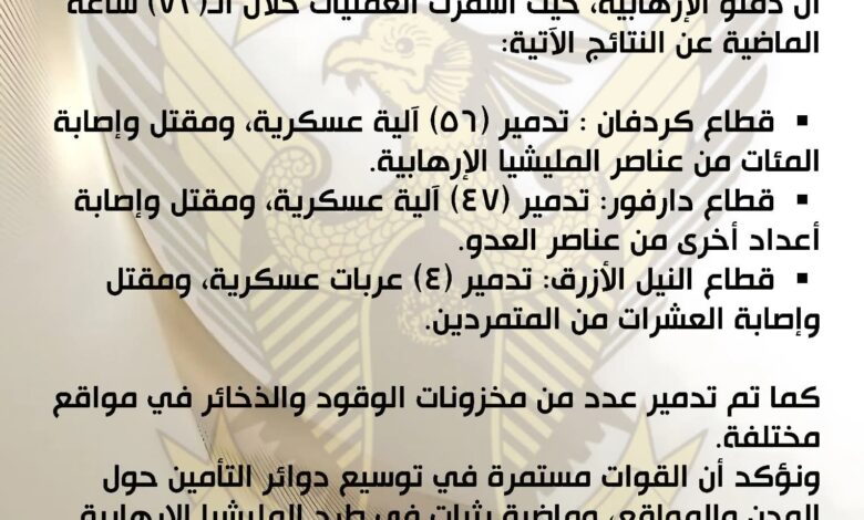 وفي قطاع دارفور، تمكنت القوات من تدمير (47) آلية عسكرية، مع إيقاع خسائر بشرية إضافية في صفوف العدو.