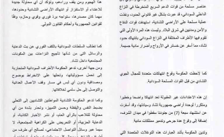 وأكد البيان أن هذه الانتهاكات تمثل خرقًا واضحًا لسيادة تشاد ووحدة أراضيها، وتشكل تهديدًا مباشرًا للأمن والاستقرار الإقليميين، مشددًا على أن الحكومة التشادية تحتفظ بحقها الكامل في الرد “القوي والحازم” وفقًا للقانون الوطني والقانون الدولي.