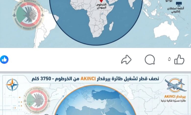 كما أظهرت الصورة الأخرى المدى العملياتي الكامل للطائرة AKINCI، والذي يعكس قدرتها على تغطية مساحات واسعة، ما يمنح القوات الجوية السودانية مرونة استراتيجية عالية في تنفيذ مهام الاستطلاع والهجوم الدقيق، وتعزيز السيطرة الجوية في مختلف مسارح العمليات.
