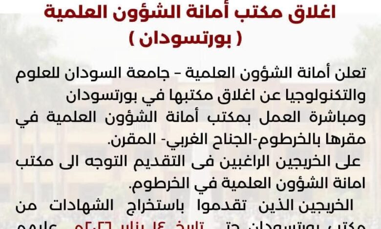 تعلن أمانة الشؤون العملية بجامعة السودان للعلوم والتكنولوجيا عن إغلاق مكتبها في مدينة بورتسودان
