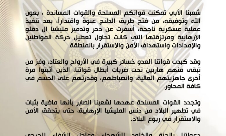 وأكد البيان الصادر عن مكتب الناطق الرسمي باسم القوات المسلحة أن العملية كبدت العدو خسائر كبيرة في الأرواح والعتاد، فيما فرّ من تبقى من عناصر المليشيا تحت ضربات القوات، التي أثبتت – بحسب البيان – جاهزيتها العالية وانضباطها وقدرتها على الحسم في مختلف المحاور.