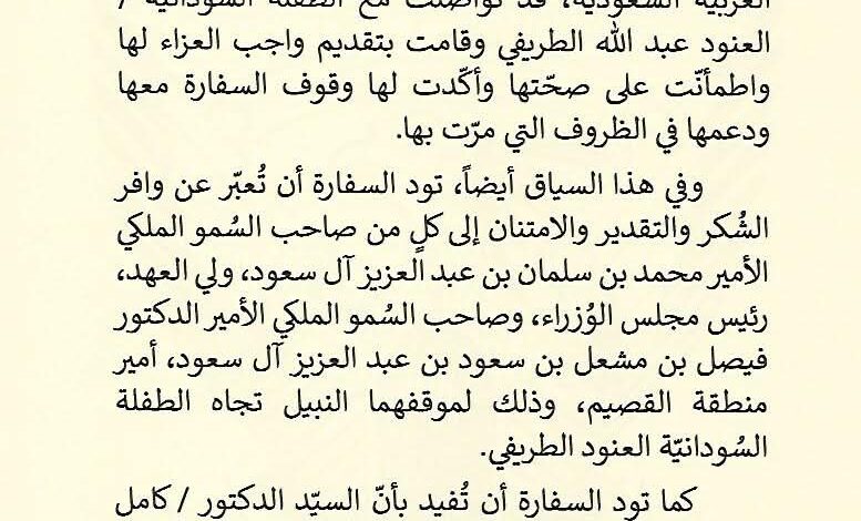 وأوضحت السفارة، في إعلان رسمي، أنها عبّرت عن بالغ شكرها وتقديرها لقيادة المملكة العربية السعودية، ممثلة في خادم الحرمين الشريفين الملك سلمان بن عبد العزيز وولي العهد الأمير محمد بن سلمان، إلى جانب أمير منطقة القصيم الأمير فيصل بن مشعل بن سعود، وذلك لمواقفهم الإنسانية النبيلة تجاه الطفلة السودانية.
