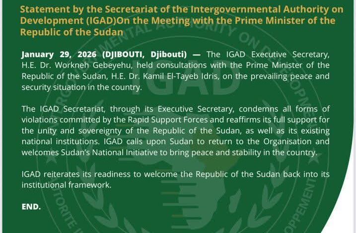 جاء ذلك في بيان صدر عن إيغاد عقب لقاء عقده الأمين التنفيذي للهيئة، د. ورقنه جبيهو، مع رئيس وزراء جمهورية السودان، د. كامل الطيب إدريس، في جيبوتي، اليوم الخميس 29 يناير 2026، حيث بحث الجانبان تطورات الأوضاع الأمنية والسلام في السودان.