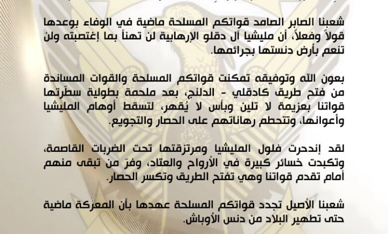 وأكد بيان صادر عن مكتب الناطق الرسمي باسم القوات المسلحة أن العملية نجحت في كسر الحصار وإسقاط ما وصفه البيان برهانات المليشيا على التجويع والعزل، مشيرًا إلى فرار ما تبقى من عناصرها أمام تقدم القوات.