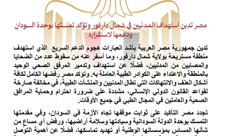 أدانت مصر بأشد العبارات الهجوم الذي استهدف منطقة مستريحة بولاية شمال دارفور، وما أسفر عنه من سقوط ضحايا ومصابين بين المدنيين، فضلاً عن استهداف المرافق الصحية والكوادر الطبية العاملة بها.