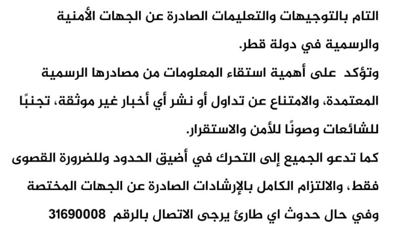 واختتمت السفارة بيانها بالدعاء بأن يحفظ الله دولة قطر قيادةً وشعبًا، وأن يديم عليها نعمة الأمن والأمان، ويحفظ أهلها وكل المقيمين على أرضها من كل سوء.