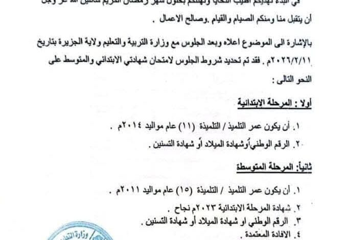 أعلنت وزارة التعليم والتربية الوطنية – الإدارة العامة للعلاقات الثقافية – عن تحديد شروط ومتطلبات الجلوس لامتحاني الشهادتين الابتدائية والمتوسطة، وذلك عقب اجتماعها مع وزارة التربية والتعليم بولاية الجزيرة بتاريخ 11 فبراير 2026م.