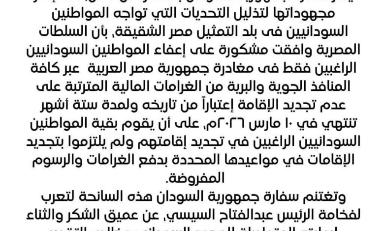 وأوضحت السفارة أن الإعفاء يسري لمدة ستة أشهر ابتداءً من تاريخه، على أن ينتهي في 10 مارس 2026، ويشمل فقط السودانيين الراغبين في مغادرة الأراضي المصرية.