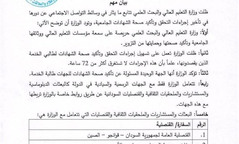 وأوضحت الوزارة في بيان لها أنها تتابع ما يتم تداوله عبر وسائل التواصل الاجتماعي بشأن دورها في تأخير إجراءات التحقق من الشهادات الجامعية، مبينة أن إجراءات التحقق وتأكيد صحة الشهادات لطالبي الخدمة لا تستغرق أكثر من 72 ساعة. وشددت الوزارة على أنها الجهة الوحيدة المخولة بتأكيد صحة الشهادات الجامعية للجهات الطالبة للخدمة، مؤكدة أن تعاملها يتم حصراً مع الجهات الرسمية والسيادية في الدولة، مثل البعثات الدبلوماسية والمستشاريات والملحقيات الثقافية والقنصليات السودانية، وذلك عبر روابط إلكترونية خاصة تربط هذه الجهات بالوزارة. وأشارت الوزارة إلى أن الجهات التي تتعامل معها تشمل عدداً من السفارات والقنصليات السودانية والملحقيات الثقافية في دول مختلفة، من بينها الصين، الأردن، تركيا، المملكة العربية السعودية، لبنان، سويسرا، الإمارات العربية المتحدة، العراق، مصر، أوغندا، سلطنة عمان، أوكرانيا، قطر، روسيا، الكويت، ليبيا، كينيا، الهند، إضافة إلى بعثات السودان لدى الأمم المتحدة في جنيف ونيروبي.